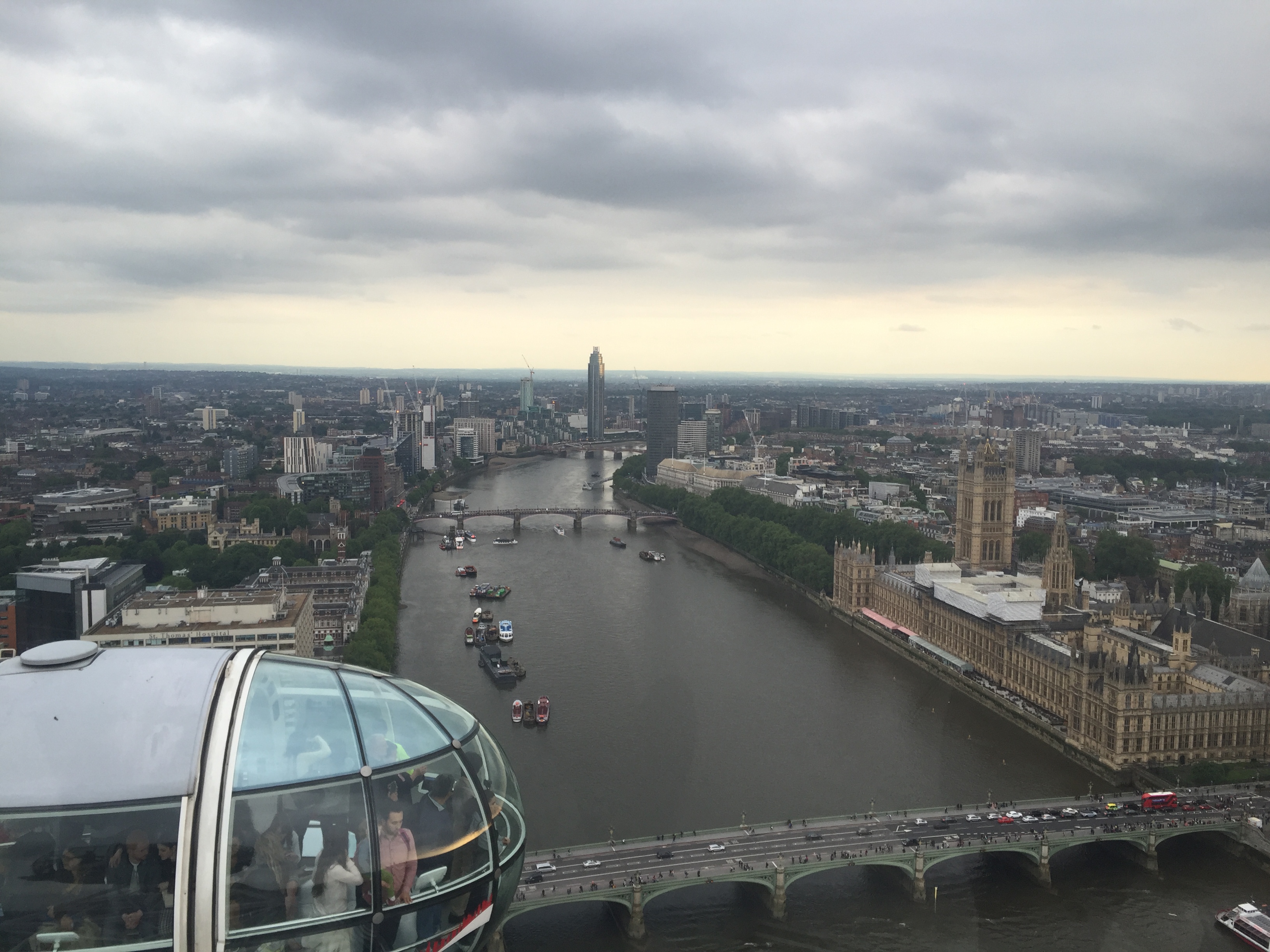 Bridges span the Thames on either side of the Parliament building very far below the London Eye