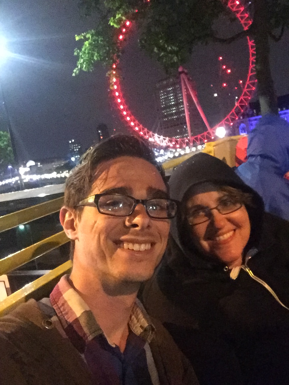 My aunt and I on a bus tour through London with the London Eye lit in red
