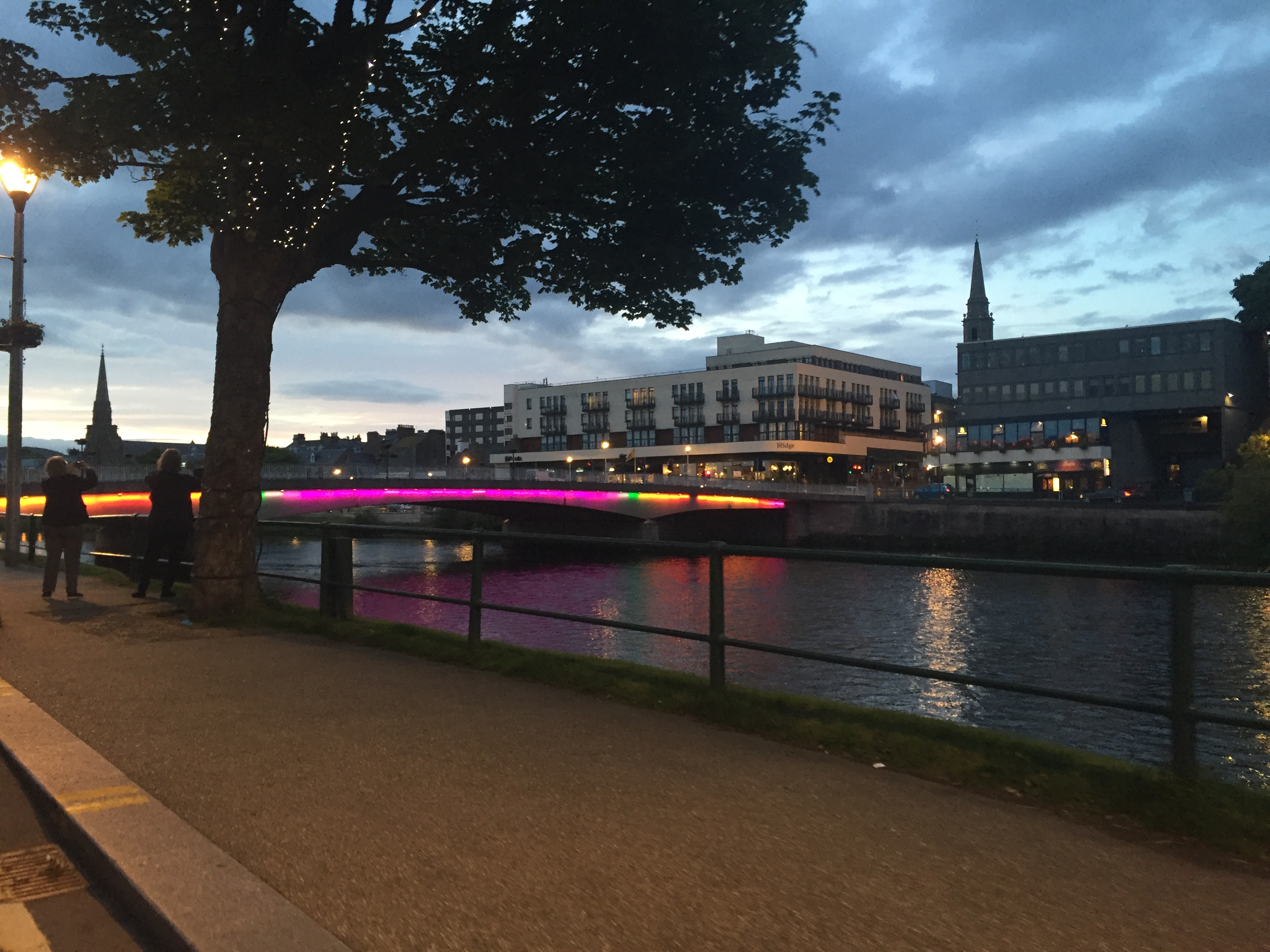 A colorful illuminated bridge spans the river in Inverness at dusk